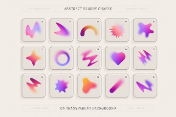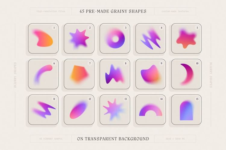 渐变形状– 45 个预制的模糊形状,带有渐变色和定制的颗粒纹理(3840 × 3840 像素,PNG,在透明背景上隔离)