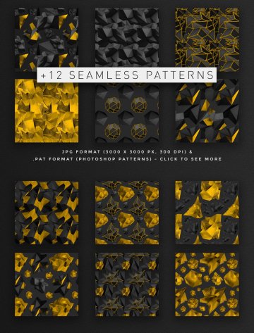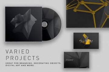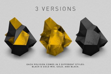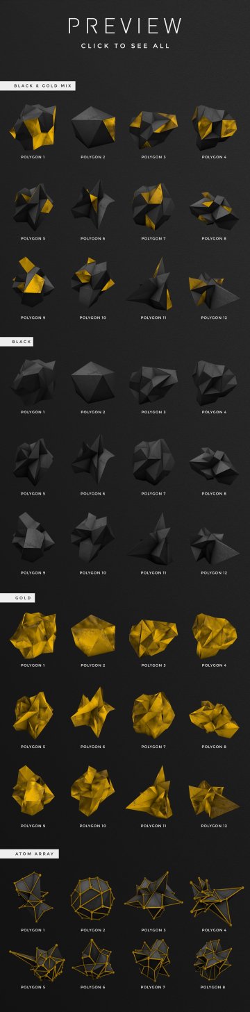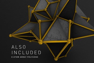这些多边形形状将为您的项目增添漂亮的现代几何风格 🙂 该套装包括由 3D 渲染制成的总共 36 个元素,每个元素都有 3 个版本:黑色和金色混合、黑色和金色。还包括 8 个“原子阵列”多边形。它们是黑色的,周围有金属金色结构。