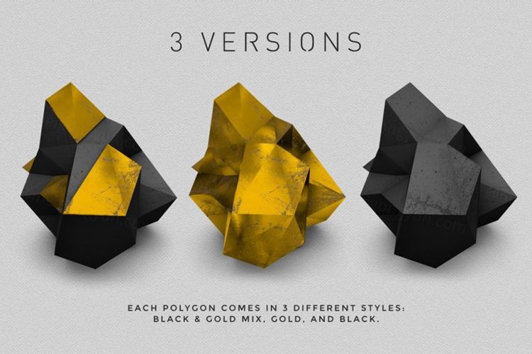 所有这些多边形都作为单独的 300 dpi 文件提供,大小在 1700 到 2500 像素之间。在透明 png 文件或分层 psd 文件之间进行选择(其中有一个可以编辑的阴影层,例如,如果您正在创建一个多边形位于地板上并因此投射阴影的设计)。