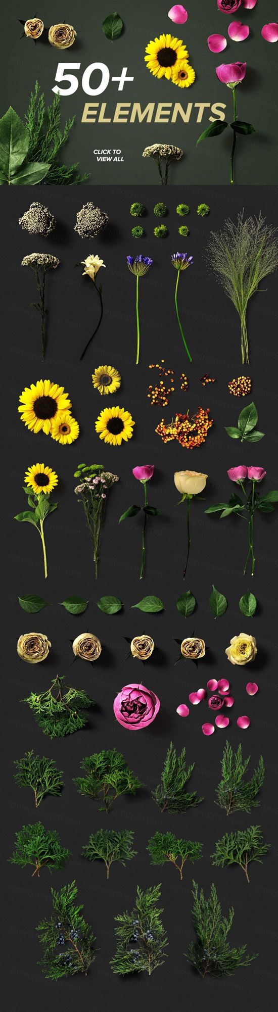一个孤立的花卉剪贴画集合,有机会成为您工具箱中不可替代的一部分!出色的照片质量、高清晰度、种类繁多的元素以及各种设计项目的花卉元素的灵活性不会让您感到寒冷,我们对此毫不怀疑。在花潮中,您会发现向日葵、玫瑰、树叶、树枝、束等等!