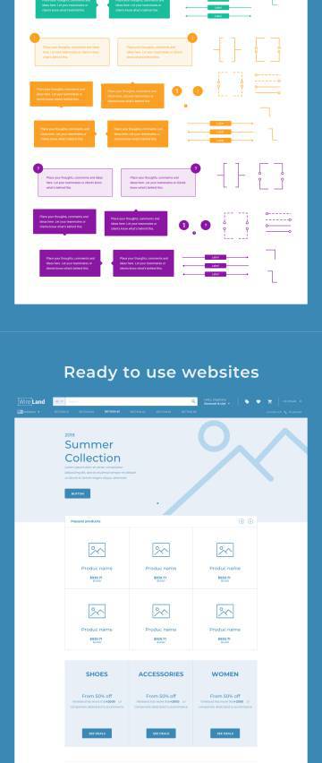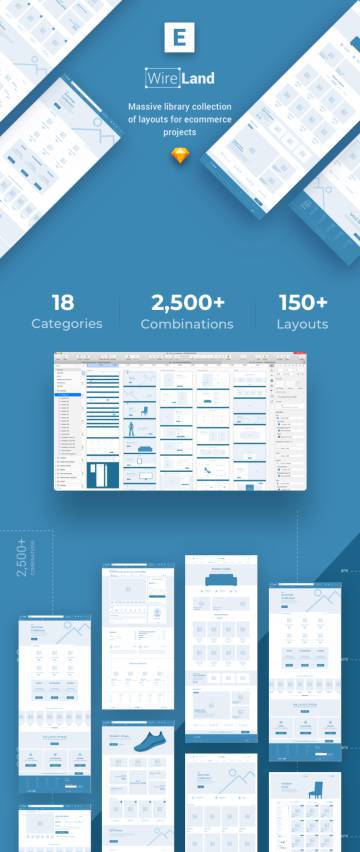 Wireland for Ecommerce是一个大规模的完整线框图集合,经过优化,可以非常快速,轻松地构建电子商务设计项目,同时获得出色的结果。该库包含180多个即用型布局部分,分为18个流行内容类别。