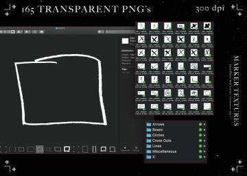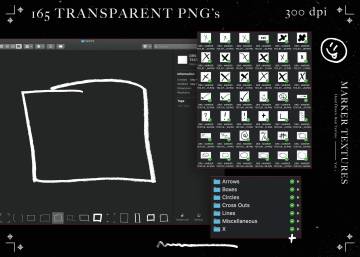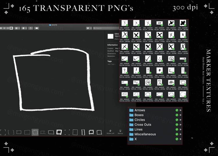 使用MARKER为您的作品增添手绘美感。165 种独特的标记纹理以 .png 格式提供,也以 Adobe Illustrator 的矢量格式提供。这些拖放元素预先制成白色、黑色和红色,可以重新映射到您想要的任何颜色。