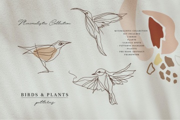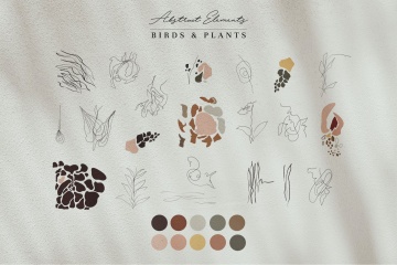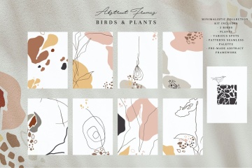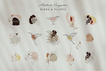 现代抽象的鸟类和花卉是一个美妙的集合,包括鸟类和植物的所有轮廓,以及动物斑点。包裹包括: