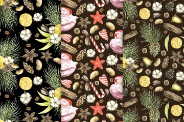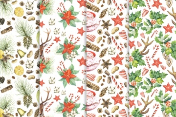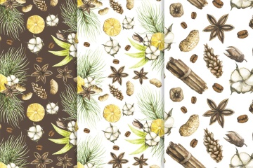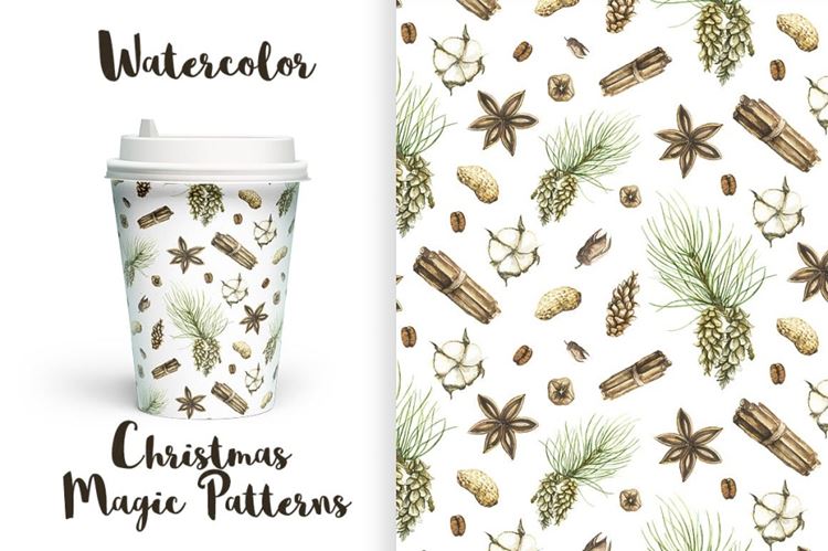 包装内含19个球果、姜饼、松枝、鹿角等JPEG水彩无缝图案。