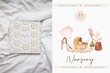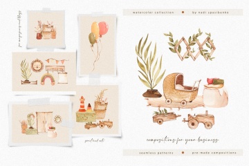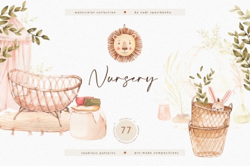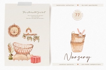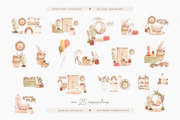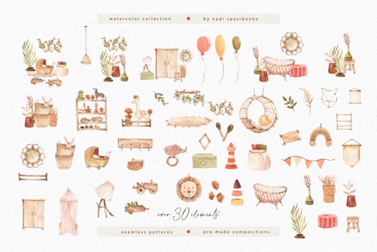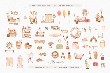 该包包括 77 个水彩剪辑。在这里,您会找到家具、一些玩具、植物、预制作品和无缝图案。您可以在预览中看到所有插图。观看愉快!里面是什么?