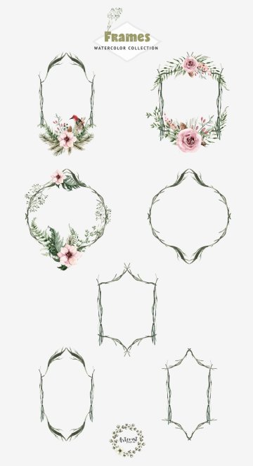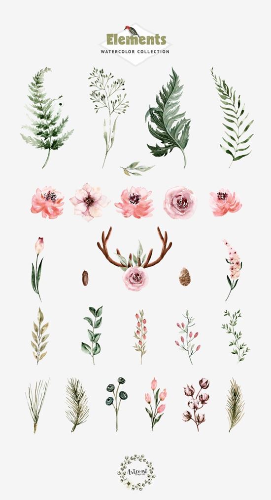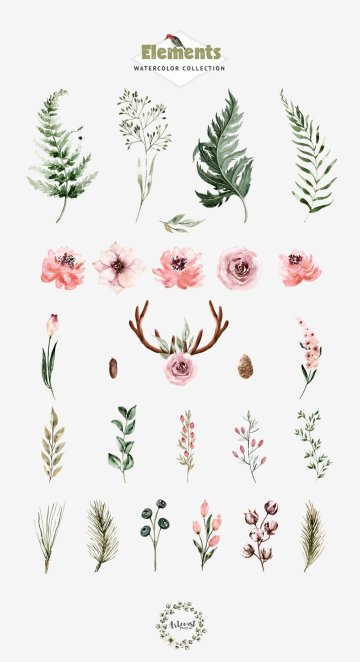图穷联素材库 » 水彩手绘树叶玫瑰牡丹花卉树枝森林装饰元素PNG剪贴画素材 W
