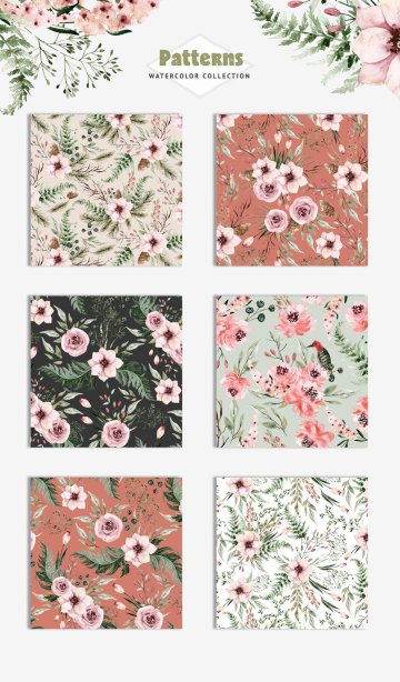 还包含5 个透明的 PNG无缝图案,带有叶子、树枝和花朵。