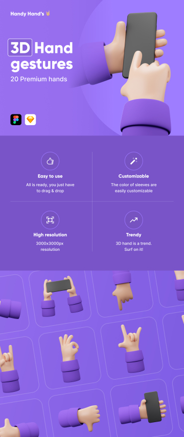该包包括 20 个手势。您可以轻松更改颜色以匹配您的品牌。