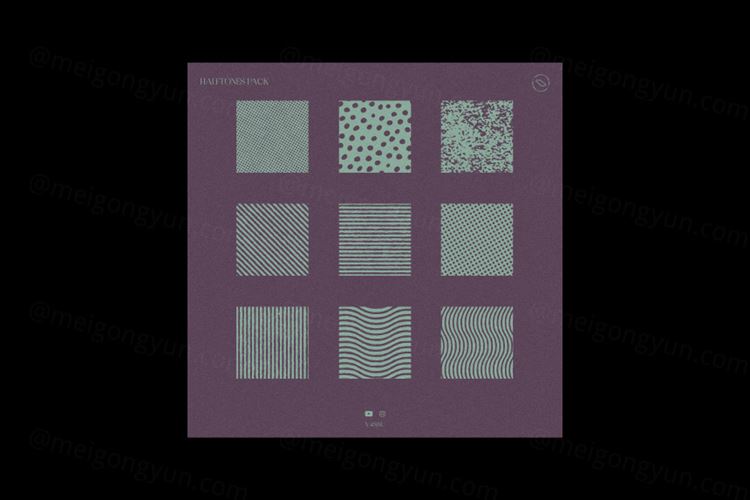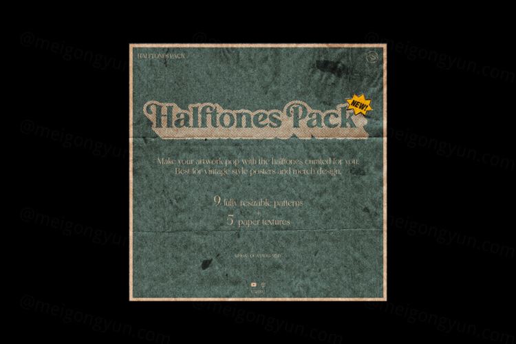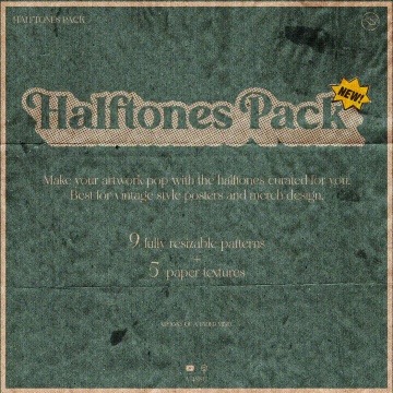 该包装包含 9 个半色调图案和 5 个纸质纹理(压碎和皱巴巴)这个包装是您将海报设计带入复古时代所需的全部。