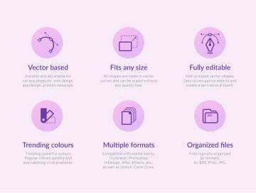 我们称这种风格为有机。插图基于自然流线型的形状,与明亮的紫罗兰色相结合。我们详细阐述了这些概念,以便有机地适应多种设计产品。