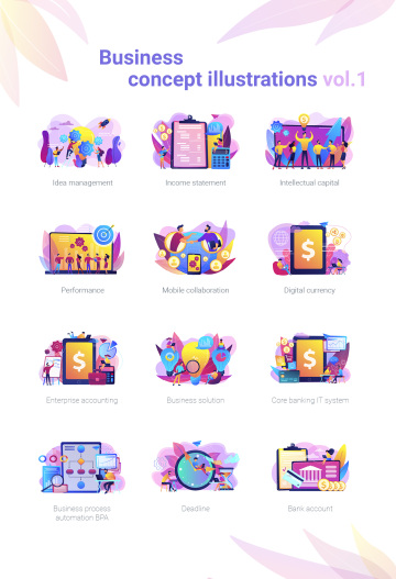 图穷联素材库 » 12款企业创意概念UI插画素材 明亮的紫罗兰配色 Business concep