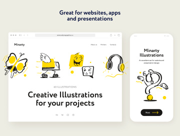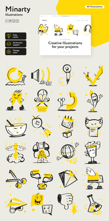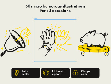 我们为您的网页呈现一组 60 幅微幽默的插图。这套大套装非常适合装饰您的网页、服务列表或产品优势。所有插图都可以尽可能简单快速地适应任何创造性任务和项目。