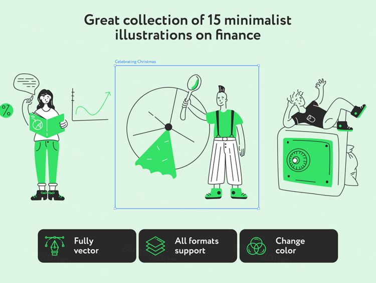 关于金融主题的 15 幅极简主义插图的精彩集合。这些插图将非常适合您的演示文稿、促销网页和文章的设计。轻松快速的改编将帮助您在项目和想法中快速实施插图。