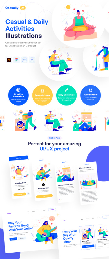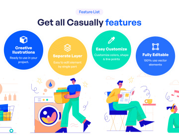 Casually 是一套适合任何创意项目的定制休闲插图。制作完全分层和分离的矢量对象。非常适合 UI/UX 设计、演示、广告等。