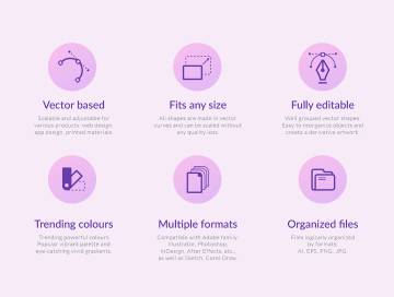 我们称这种风格为有机。插图基于自然流线型的形状,与明亮的紫罗兰色相结合。我们详细阐述了这些概念,以便有机地适应多种设计产品。