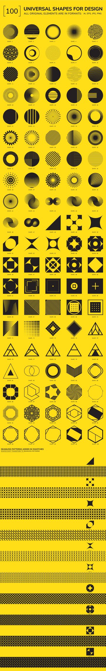 为您的最佳项目设置 100 个单独的几何形状 +BONUS - 10 种无缝图案。所有对象都可以轻松转换为无缝模式。黑色通用矢量几何元素适用于标志设计、名片、品牌书籍、摄影、海报、明信片、图案等。