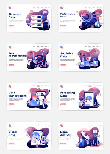 数据分析设置插图,性能数据,数据表示,统计数据,数据管理,数据处理,全局数据,信号分析,结构数据的概念,可用于入门移动应用程序,Web登录页面,横幅,海报。矢量插图