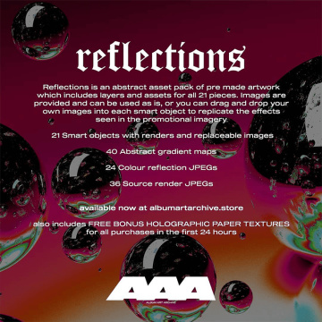 Reflections 是预制艺术品 PSD 文件的抽象资产包,其中包括所有 21 件的智能对象层和资产。提供图像并可以按原样使用,或者您可以将自己的图像拖放到每个智能对象中,以复制在宣传图像中看到的效果。