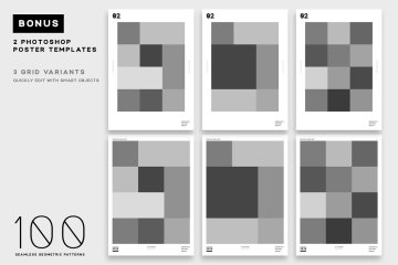 无缝几何图案包本质上是一个迷你设计包。您不仅可以获得100 种无缝图案,而且我还包括两个 Photoshop 海报模板,包括三个网格指南,以及两种免费字体: Brada Light 和 Brada Bold。关于这些字体的更多信息可以在这里找到: