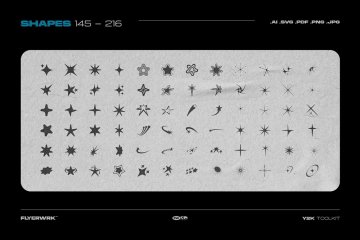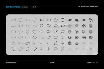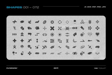 该工具包的灵感来自 1990 年代和 2000 年代初的 Y2K Rave 艺术、世嘉 Dreamcast 和 Playstation 封面艺术。有超过 200 种独特的形状和额外的图形资产来庆祝千年之交。非常适合街头时尚品牌、标志设计、海报和社交媒体图形。