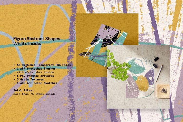 Figura 的灵感来自于抽象绘画中的元素之美、简单的形状、绘画中每一笔笔触的粗糙度。由墨水、画笔和蜡笔制成的真实抽象形状创建。每个形状都扫描成数字版本并精心制作,以获得形状本身的最大形状和细节。如果您在 Figurá 形状内部看到纹理,则可以看到纹理,但要获得最高质量,您可以使用此包中也包含的纹理纹理。