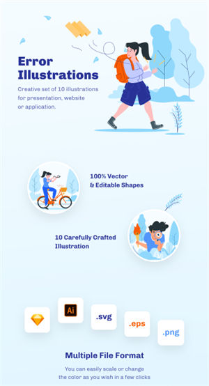 有10个令人敬畏的场景插图,错误活动。每个插图都是100%的矢量。您可以轻松地将其缩放到您需要的尺寸,并将其用于打印,应用程序,T-shift等。插图非常易于使用。您只需单击几下即可更改颜色和形状。