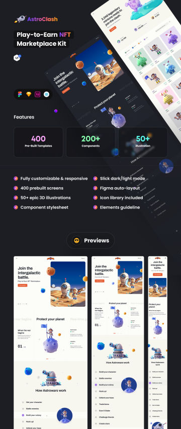 认识 AstroClash,这是一个功能齐全的 Play-to-Earn 市场工具包,包括可在 Figma 中编辑的独家设计文件以及一组定制的精美 3D 插图。
