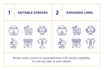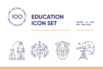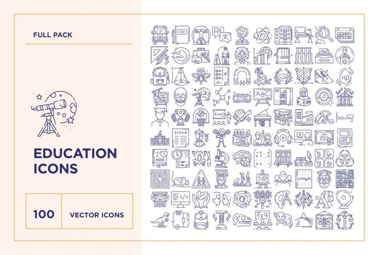 这套包括校车、笔记本、天文学、考古学、生物学、建筑学、地理、语言学、艺术、历史、医学、物理、化学、心理学、信息学、计算机科学、应用数学、应用物理学、数学、教育学、政治学的图标科学,心理学,自然科学,生态学,自然科学,神经生物学,物理科学,生物科学,社会科学,形式科学,逻辑,应用科学,力学,哲学,经济学,统计学,法学,工程学,笔记本,维特鲁威人,翻译器, 地球, 原子, 宿舍, 电脑, dna, 日历, 文具, 科学实验, 爱因斯坦, 背包, 几何, 烧瓶, 归档, 领导, 成绩, 磁铁, 考试, 毕业帽, 画画, 头骨, 望远镜, 闹钟, 板, 储物柜, 老师, 学生, 校服, 奖品, 钥匙, 钢琴, 棒球,篮球, 大学, 学校, 式, 演讲, 棱镜, 太阳系, 啦啦队长, 视频课, 文凭, 计数器, 显微镜, 脑, 矩阵, 元素周期表, 猫头鹰, 迷宫, 实验室大鼠, 图书馆, 恐龙, 特斯拉线圈和更多教育相关话题。