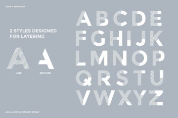 Bank(现在称为 BankNue)是一种现代的全大写显示字体。专为当代设计风格和应用而开发,提供两种风格;内衬和分段。这些样式经过精心设计,可以相互叠加,创造出另一种样式。这可以通过复制分段样式并移动/偏移它来进一步扩展,创造出让人想起胶印或 3d 浮雕的外观。此功能允许您设置不同的颜色、不透明度和混合模式设置,提供大量可能的结果。