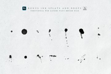 作为下载的一部分,我包含了 8 个高分辨率纸张纹理 (6000 x 4000px) 以及 14 个 Ink splats。Ink splats 以 600 dpi 的分辨率进行扫描,并以 psd 格式(每个都在其自己的具有透明背景的命名图层上)和 Photoshop 画笔集的形式提供。