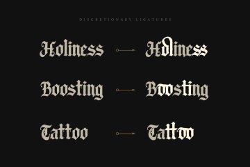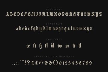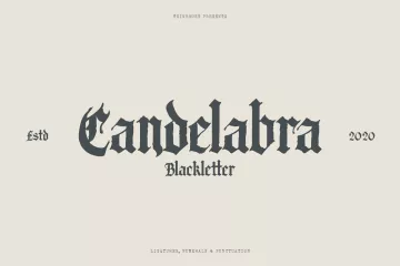 Candelabra 是一种充满中世纪神秘主义和年代感的黑色字体。纹身工作室、乐队标志和专辑艺术、时尚时尚服装、书籍封面、游戏设计、包装设计等的理想选择。这种个性丰富的字体可以轻松实现历史和现代美学。