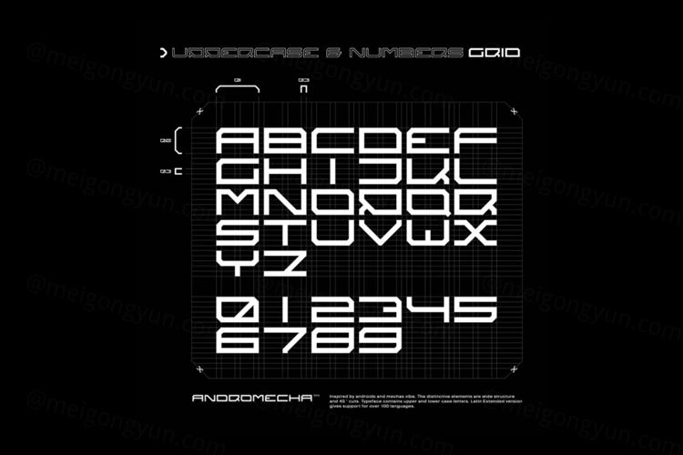 Andromecha 是一种大写和小写显示字体,支持 100 多种语言。灵感来自 androids 和 mechas vibe。独特的元素是具有 45° 切割的宽结构。
