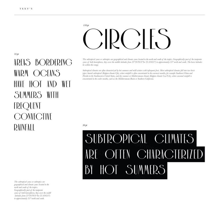 “Santa Catarina”是一种所有圆角字符都变宽,其余变窄的字体。由于字形的宽度不均匀,出现了有趣的显示效果。该字体非常适合标题和海报。