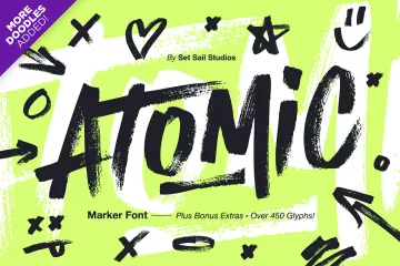 Atomic Marker Extras 包括 26 个“涂鸦”(见图)和 23 个下划线,旨在与 Atomic Marker 字体字母完美搭配。只需将其安装为自己的单独字体,然后键入 AZ(涂鸦)或 aw(下划线)即可访问每个设计。