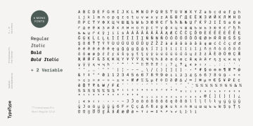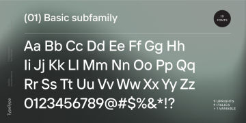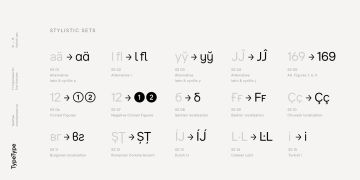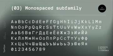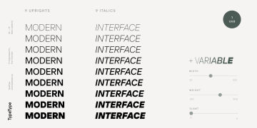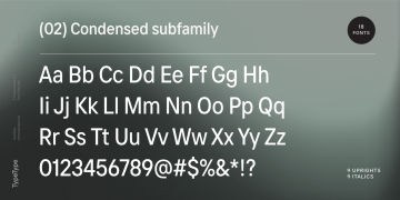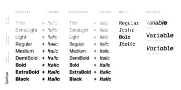 TT Interphases Pro 包含 37 种样式:18 种直立字体、18 种斜体和 1 种可变字体,每种字体有 978 个字形。该系列包含 24 个 OpenType 功能,其中有表格版本、分子、数字和货币的分母,以及字符 a、l、y 的替代形式。等宽子系列由 6 个字重组成:2 个直立字、2 个正斜体字和 2 个可变字体。它包含 18 个功能性 OpenType 特性。