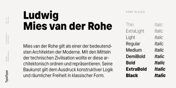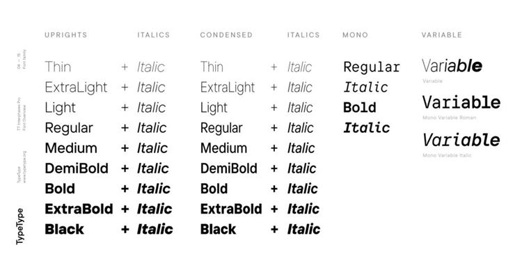 我们特别注意了字体的可变版本,您现在可以在其中更改笔画的粗细、字符的宽度和笔画的倾斜角度。从细到黑,从浓缩到正常,从 0 到 11 度——因此我们拥有与 TT Interphases Pro 相媲美的可变字体。