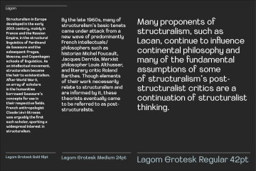 Lagom Grotesk 是一种具有强烈风格几何对比的当代新怪诞无衬线字体。其独特的开放姿态旨在为品牌和传播提供正确的视觉一致性,代表不断变化的当代美学。独特的姿态为品牌和沟通提供了正确的视觉一致性。