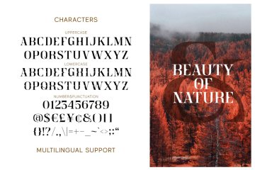 Crainzel 是一种精致的高对比度显示衬线字体。连字字符使这种字体独一无二,并且比常规的衬线字体更突出。非常适用于标志、标题、标题和其他各种正式形式,如请柬、标签、标志、杂志、书籍、贺卡/婚礼卡、包装、时尚、化妆、文具、小说、标签或任何类型的广告目的.