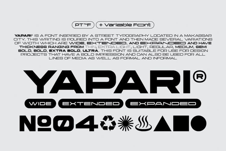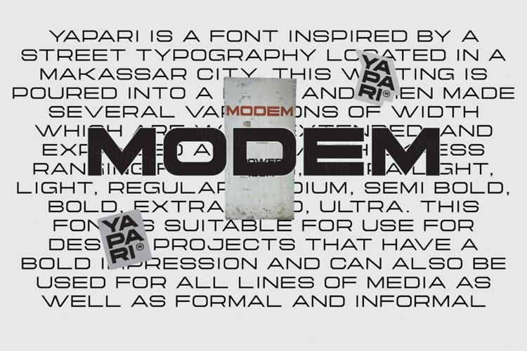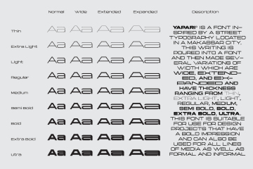 YAPARI是一种字体,灵感来自位于望加锡市的街头排版,这种文字被倒入字体中,然后制作了几种宽度变化,即Wide、Extended和Expanded类型的拉伸字体,然后厚度范围从Thin、Extra Light , Light, Regular, Medium, Semi Bold, Bold, Extra Bold, Ultra。此字体适用于具有大胆印象的设计项目,也可用于所有媒体线以及正式和非正式