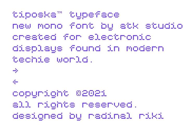 由 Atk Studio 设计的具有技术和实验风格的新等宽字体。专为现代技术世界中的电子显示器而设计。此类型具有拉丁标准字符集,涵盖使用拉丁脚本编写的多种语言。