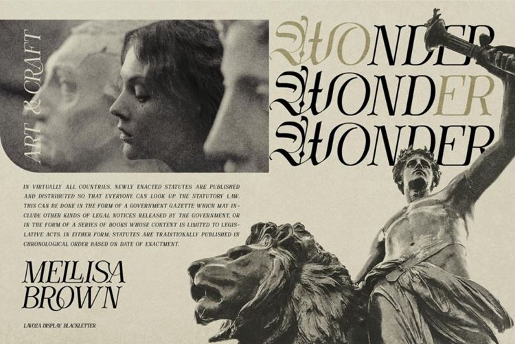 LAVOZA 字体是通过将倾斜的 blackletter 字体与经典的 serif 字体样式相结合而设计的。Lavoza 字体的灵感来自经典的罗马设计,我们根据当前趋势应用现代元素。这个大胆的经典概念将创造一个令人恐惧但仍然看起来现代和优雅的设计。Lavoza 字体非常适合敢于与当前流行的设计理念不同和独特的年轻人的设计。强烈建议将 Lavoza 字体作为当前或未来设计创作的字体集合。