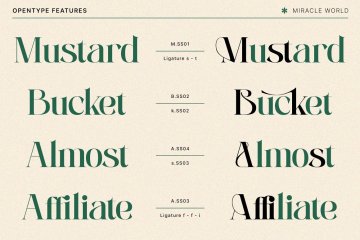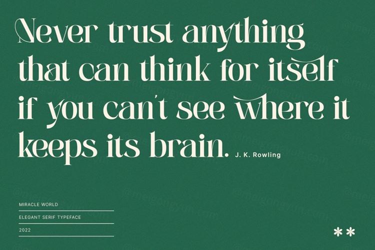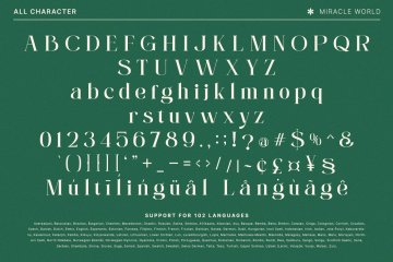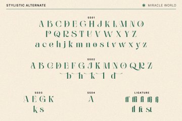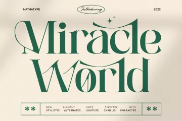 Miracle World是一款优雅的衬线字体,可将您的设计提升为奇迹。应用于任何目的都不会出错。字体的重量旨在为任何标题/标题带来力量。另一方面,人物的曲线传达出一种优雅的感觉。它还具有迷人的功能,可帮助您最大化您的设计。