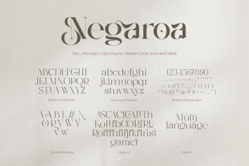 Negaroa 还带有多种语言,使其易于用于任何国家和语言的使用。它还带有替代连字和样式,使您的设计更具吸引力。Negaroa 适用于品牌项目和各种设计目的,例如名片、名牌、制服作为品牌提升。广告、海报、邀请函、品牌、标志、杂志、商品、演示文稿等。