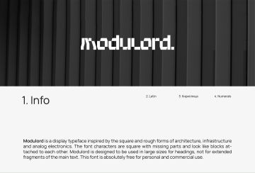 Modulord是一款显示电视机,其灵感来自于建筑、基础设施和模拟电子的sauare和rouch形式。字体字符是正方形的,有缺失的部分,看起来像彼此相连的块。Modulord设计用于大尺寸的标题,而不是主文本的扩展部分。此字体绝对免费供个人和商业使用。