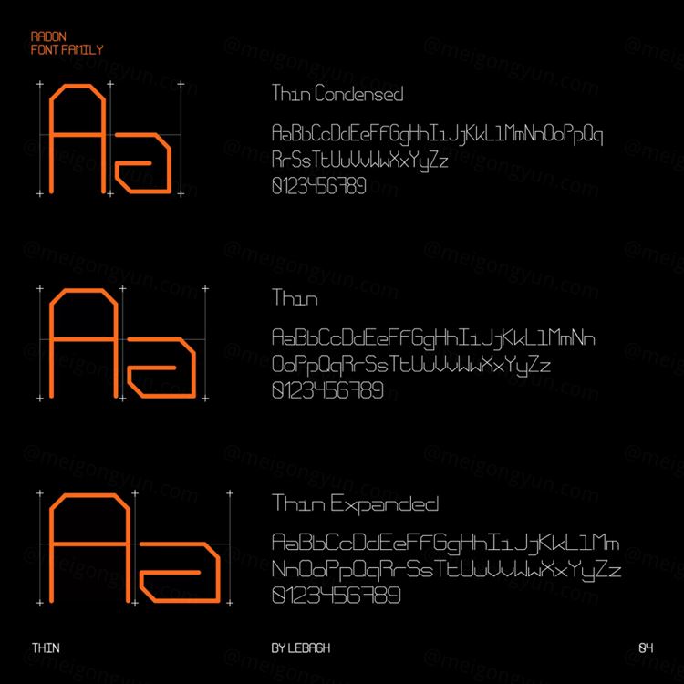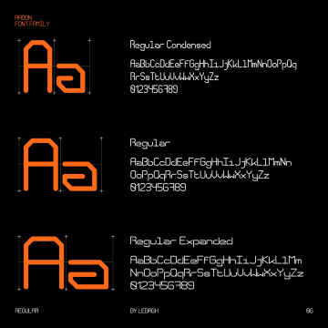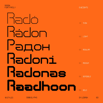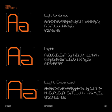 Radon 是一个等宽字体系列,包含 18 种样式。字体使用简单的线条来形成字符。每个字形有 552 个,它支持拉丁文和西里尔文。它们有压缩的、正常的和扩展的宽度。