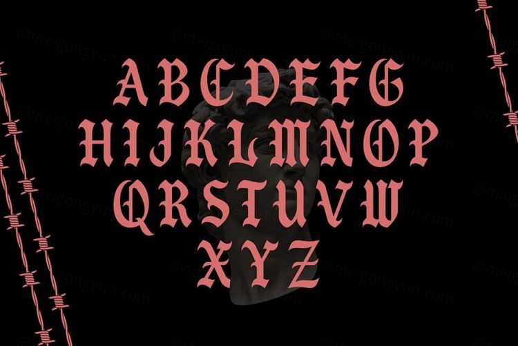 巴比伦字体包括大写字母、数字、范围广泛的标点符号。具有现代风格的 Blackletter 字体。为海报、网页设计、品牌、插图、徽章、衬衫设计和其他一些作品而创建。