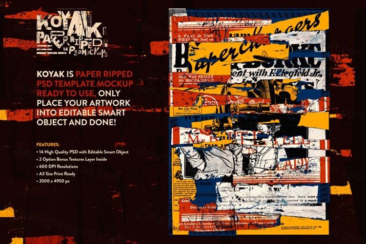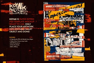 受垃圾海报纹理、大师的拼贴艺术作品和布鲁克林街头艺术和丝网印刷场景中的失败艺术作品的启发,Koyak 是准备使用的 PSD 样机模板,只需将您的艺术作品放入放置的智能对象中,然后保存它!完毕。使用真实的纸张撕破艺术品,以高分辨率扫描,将其更改为数字版本,并在Photoshop 中进行详细制作,以便您轻松修改其中的内容。