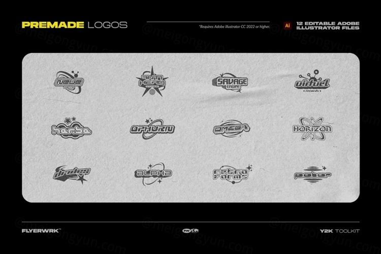 该工具包的灵感来自 1990 年代和 2000 年代初的 Y2K Rave 艺术、世嘉 Dreamcast 和 Playstation 封面艺术。有超过 200 种独特的形状和额外的图形资产来庆祝千年之交。非常适合街头时尚品牌、标志设计、海报和社交媒体图形。