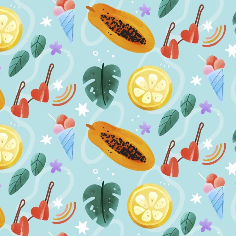 图穷联素材库 » 夏季暑假夏天棕榈叶爱心太阳镜柠檬夏日装饰无缝拼接图案素材 S
