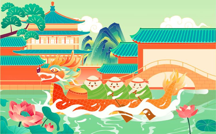 图穷联素材库 » 端午节河流中赛龙舟比赛粽子古城山峰莲花场景EPS矢量插画素材